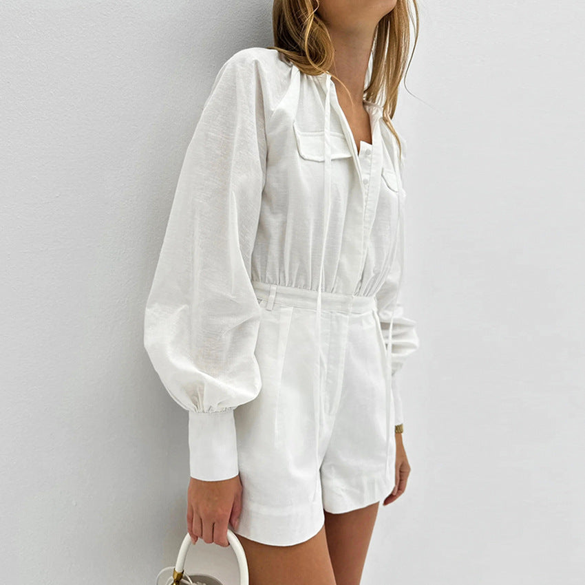 Fashion Loose White Slub Cotton Jumpsuit For Women