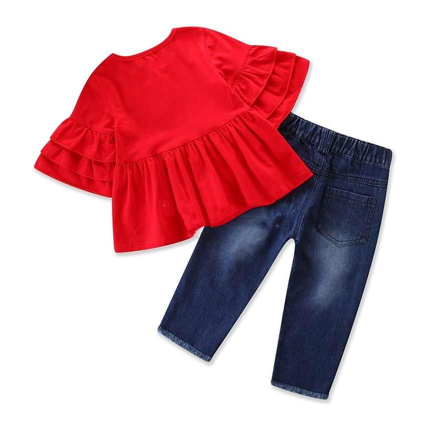Girls' Suit Trendy Trumpet Sleeve Top Embroidered Jeans Suit
