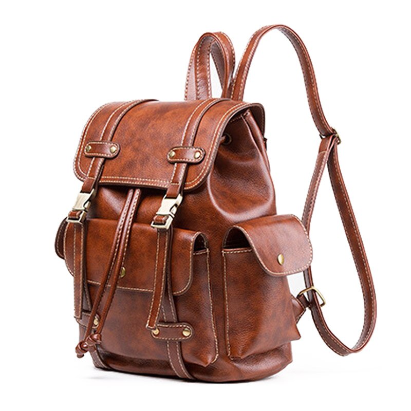 Vintage Leather Backpack Women Fashion Big Drawstring Backpack School Travel Bag